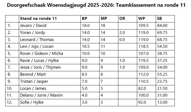 Woensdag 8 april was er voor de woensdagjeugd weer een Doorgeefschaakavond. Zie hieronder het klassement na 11 ronden. Het duo Jevaro/David wist haar koppositie te handhaven. Op 3 juni zal de laatste Doorgeefschaakavond van dit seizoen plaatsvinden.