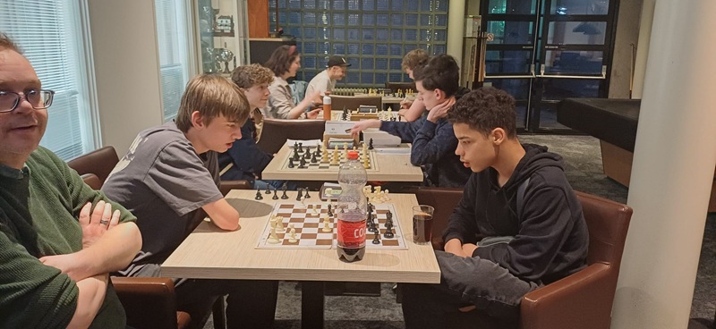 De eerste partijen waren vrij snel klaar. Derek had een leuke koningsaanval, en Simon ging helaas zelf mat. 1-1.