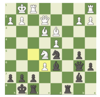 met mijn dame en ruilen we dames af. Maar na 20…Lxe5 speelde hij direct 21.Lxh7+, als ik hier pak dan komt 22.Dh5+ Kg7 23.exf7, en dan moet ik mijn toren opgeven, dus mijn vermoeden was dat 21…Kh8 de beste zet zou zijn. En na 22.Dh5 had ik 22…Pf6 in gedachten, maar ik kwam er na het spelen van 22.Dh5 achter dat dat natuurlijk niet
