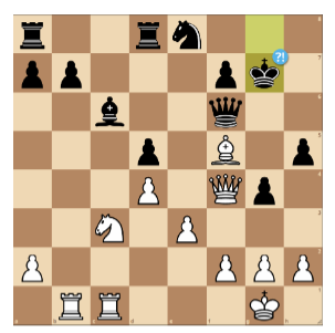 De exacte sterkte van deze zet had ik duidelijk onderschat. Ik had uiteraard wel gezien dat hij hier dreigt om bijv. Dh5 te spelen, of Lxh7 en dan Dh5. Maar ik had een aantal cruciale