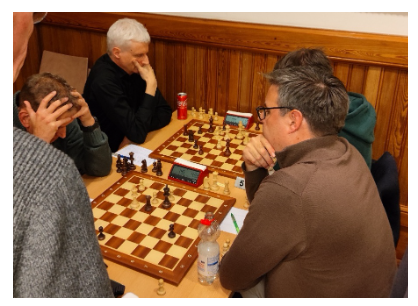 Bord 4 Chris met zwart. “Met zwart op bord 4 bood mijn tegenstander op de 26e zet remise aan. Gelijke stand, maar mijn loper stond door eigen pionnen ingesloten. Positioneel stond mijn tegenstander iets beter, dus ik nam zijn remiseaanbod graag aan. We stonden ruim voor op dat moment, dus waarom niet… Maar de overige partijen eindigden niet zo gunstig voor ons. Gelukkig wonnen we nog met de kleinst mogelijke marge”.