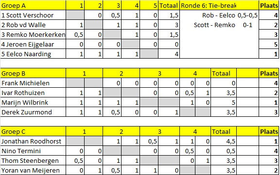Messemaker heeft nog één punt nodig voor de overwinning. En dat zal van Scott moeten komen, want Sjoerd heeft enig tegenspel met zijn vrijpion maar staat in hogere zin nog steeds verloren. Scott doet het heel goed, zijn aanval slaat door en hij komt een stuk voor in een eindspel waarin Karel nog wel een pion meer en tegenspel heeft. Er zijn slechts een paar nauwkeurige zetten nodig … Scott doet het in eerste instantie prima en heeft de winst binnen handbereik. Maar na zijn torenruil blijkt de vrijpion van Karel opeens heel gevaarlijk. Die was nog te stoppen geweest met een mooie paard-pirouette met remise als resultaat, maar in vliegende tijdnood mist Scott deze kans en geeft zich over op het moment dat hij door zijn vlag gaat. Hartbrekend, maar gelukkig revancheert Overschie zich op bord 6, waar Daan in tijdnood zijn gewonnen eindspel niet kan verzilveren. Daarmee redt Sjoerd een half punt voor Messemaker en hiermee eindigt deze titanenstrijd op een gelijkspel (4-4). Ik denk dat beide ploegen hiermee nu wel kunnen leven.