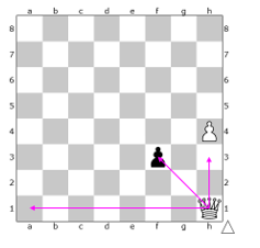 Ronde 6: All-the-way De toren, dame en loper mogen in een richting alleen de maximale afstand afleggen. Dit betekent dat de dame in het diagram hieronder alleen naar h3, f3 en a1 kan.