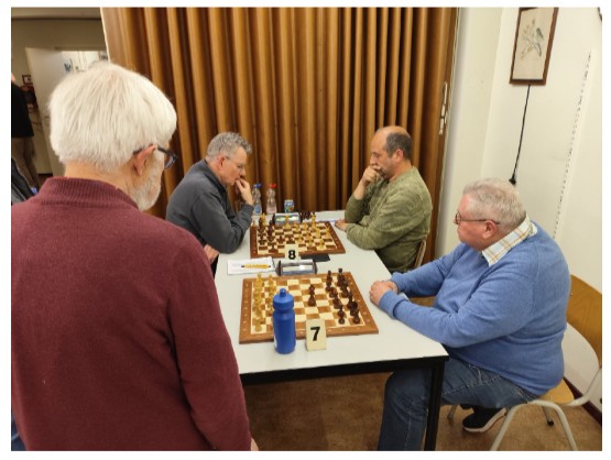 Peter met wit bereikte geen echt voordeel vanuit de opening en in het middenspel (hij heeft volgens de comp ook enige tijd wat minder gestaan), maar wist uiteindelijk toch een “rotte kies” op c5 aan te boren. De druk werd flink opgevoerd en toen ging zijn tegenstander de fout in waardoor hij niet één maar twee pionnen ging verliezen. Dat was al snel onhoudbaar.
