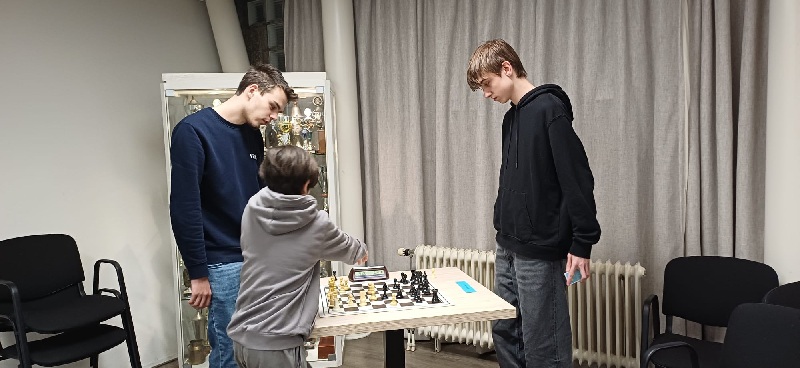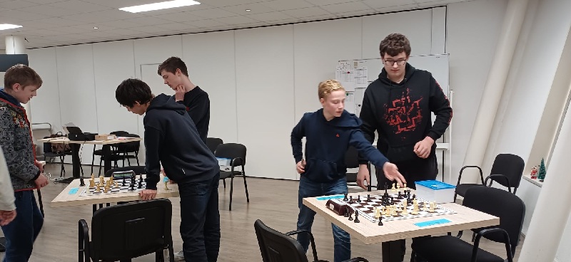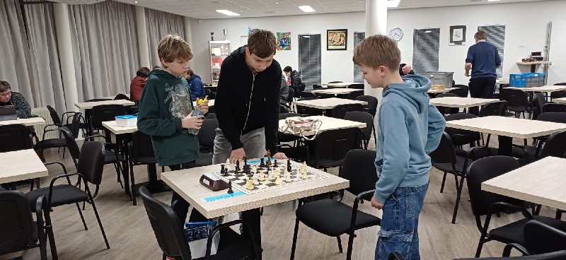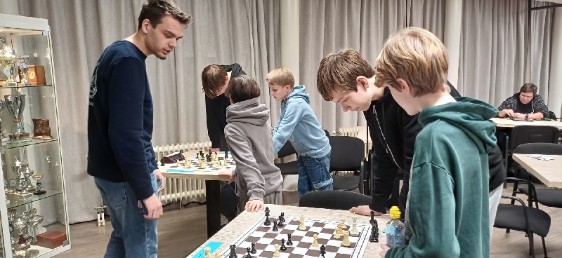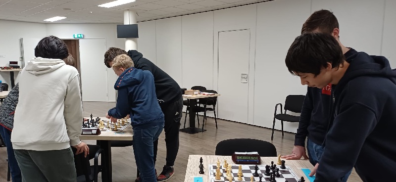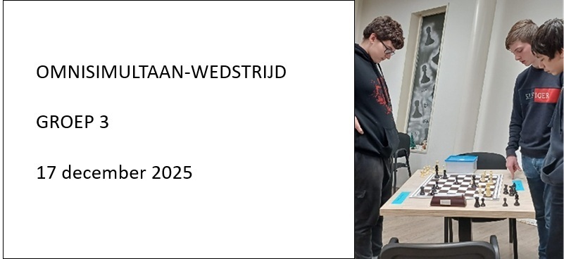 Op de laatste schaakavond van de woensdagjeugd was er voor Groep 3 een Omnisimultaan-wedstrijd georganiseerd. Hierbij speelt de jeugd in tweetallen op twee borden tegelijk tegen twee andere tweetallen. Onderling overleg is daarbij geoorloofd en zelfs de bedoeling. Dat ging de jeugd goed af, getuige onderstaande foto’s. Winnaars werden David (die bijgestaan werd door Marijn) en het koppel Berend/Tristan.